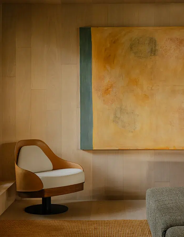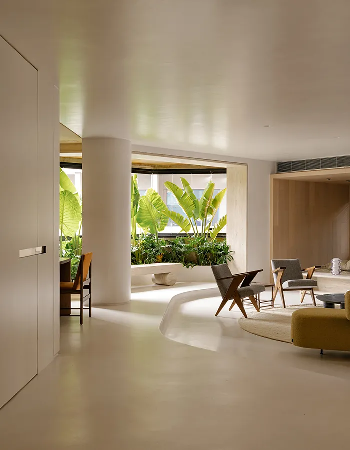 Cette sensation d’unité est renforcée par un traitement presque monolithique des surfaces. Sols, murs et plafonds se parent d’une finition minérale claire, sans joints visibles, qui unifie les volumes et capte la lumière naturelle. Cette teinte blanc cassé agit comme une toile de fond silencieuse, révélant les œuvres et le mobilier sans jamais les concurrencer. La lumière, amplifiée par l’ouverture des espaces et les reflets subtils des matières, devient une composante essentielle du projet.