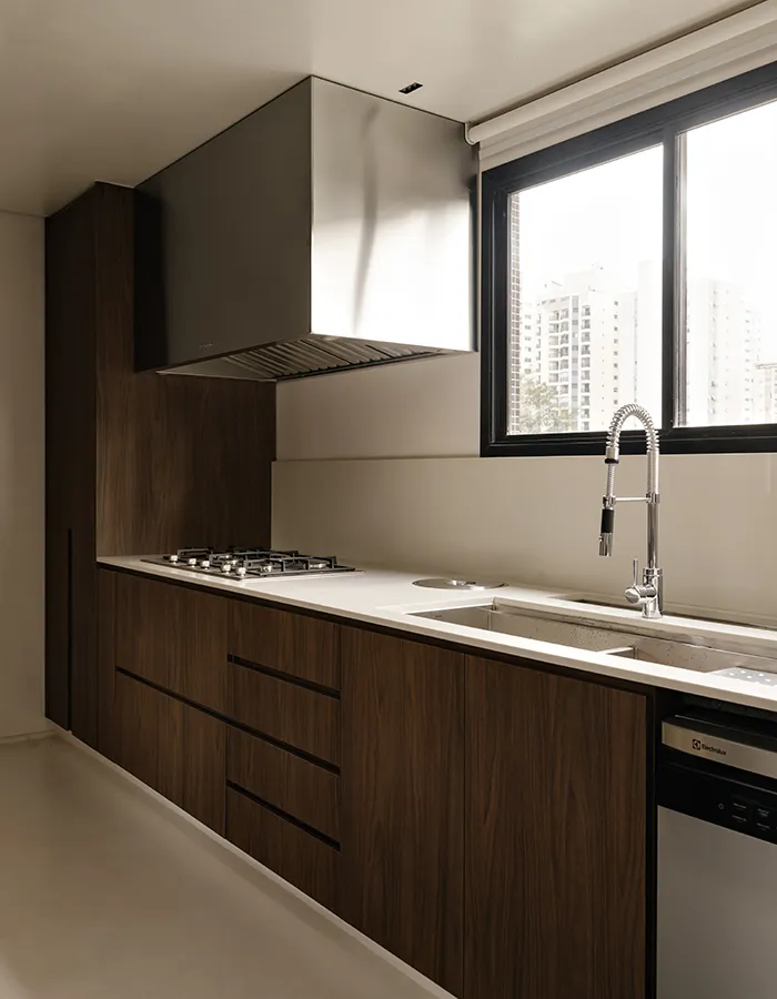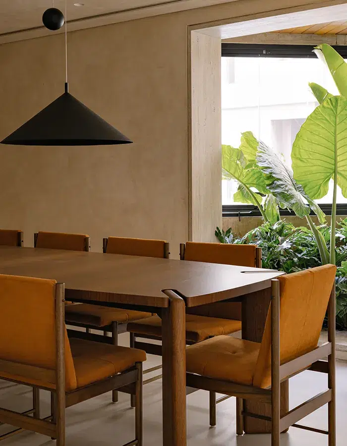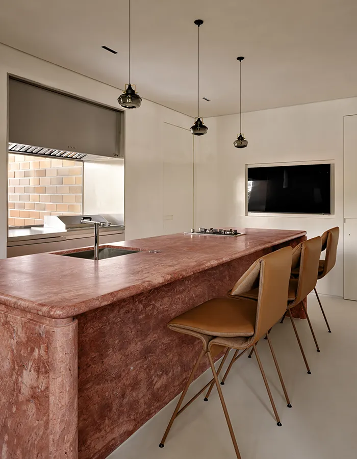 La salle à manger adopte une tonalité plus enveloppante. Les murs et le plafond, habillés d’une texture beige, composent un espace chaleureux. La table en bois massif dessinée par les architectes s’accompagne des chaises couleur caramel Prima de Bernardo Figueiredo, tandis que les suspensions E-cone dessinées par Carolina Maluhy pour Lumini ponctuent l’espace par leur présence sculpturale. Dans la cuisine, l’îlot en marbre travertin rouge aux arêtes adoucies devient le cœur social de l’appartement. La pierre, présente du séjour aux salles d’eau, agit comme un fil conducteur.