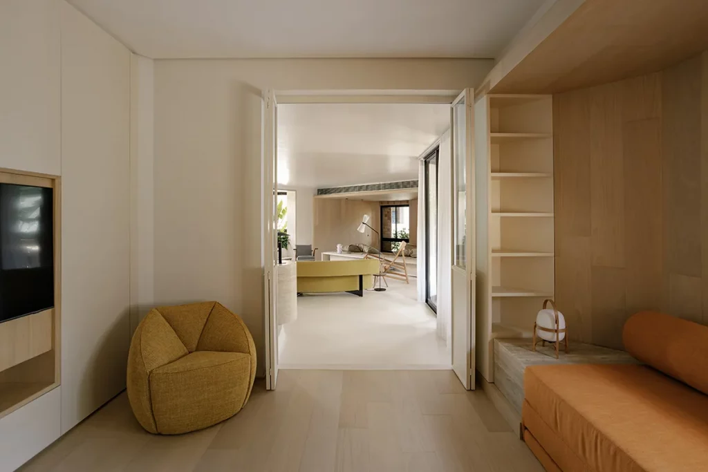 Le projet repose sur un geste fondateur : transformer les ruptures en transitions. Les marches, autrefois abruptes, deviennent des paliers élargis aux contours arrondis. Les angles droits s’effacent au profit de courbes enveloppantes qui accompagnent les mouvements du corps. L’espace n’est plus une juxtaposition de pièces, mais une continuité fluide où chaque seuil suggère un usage.