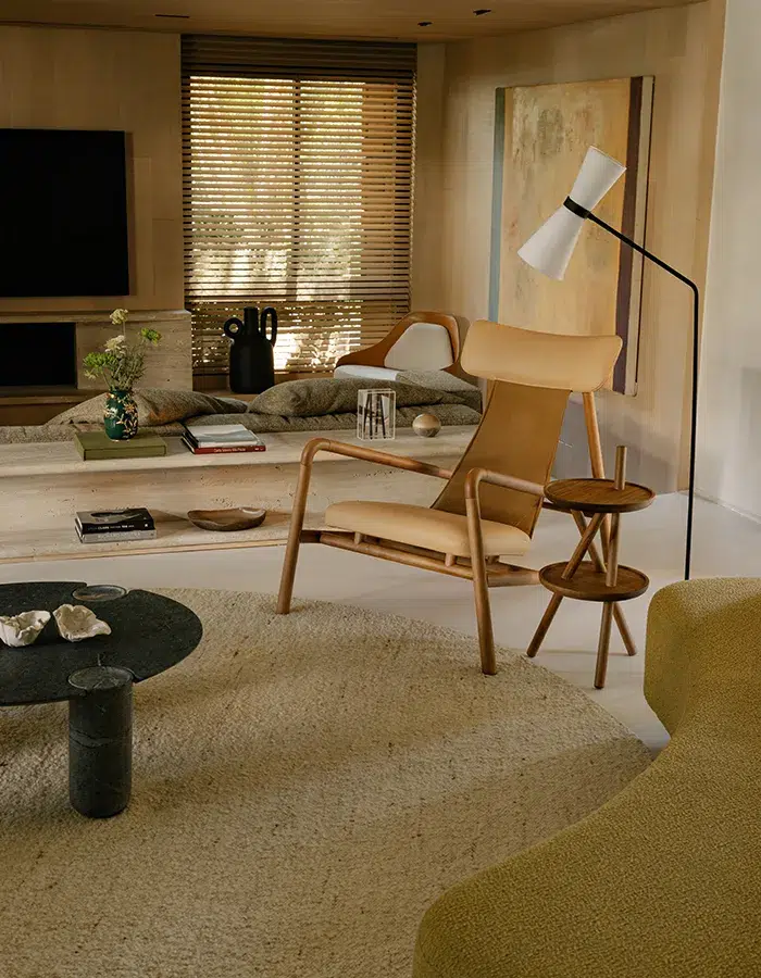 Le séjour, installé au niveau principal, s’organise autour d’un tapis circulaire qui structure les assises en un cercle propice à la conversation. Le canapé C-Curvo de Zanini de Zanine dialogue avec une sélection emblématique du design brésilien moderne et contemporain : une paire de fauteuils Zanine N signés José Zanine Caldas, le banc Magrini de Sergio Rodrigues, le fauteuil Vale de Roberta Banqueri ainsi que la table basse Triz de l’agence estudiobola. Bois, cuir, pierre et tissus variés composent une palette chaleureuse où l’artisanat affleure avec subtilité. Le mobilier prolonge le discours architectural, inscrivant le projet dans une culture locale assumée, entre figures historiques et jeunes designers avant-gardistes.