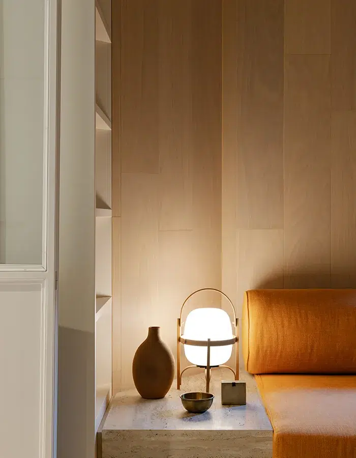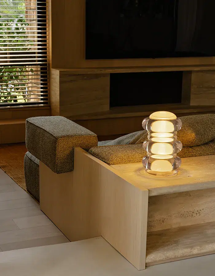 Dès l’entrée, l’intention est lisible. Un banc en marbre éclairé par le dessous invite à ralentir le pas. Juste après la porte principale, un totem sculptural taillé dans la même pierre, à la fois support fonctionnel et présence plastique, affirme un équilibre délicat entre masse et légèreté. Dépassant la simple organisation, l’architecture intérieure compose une atmosphère.