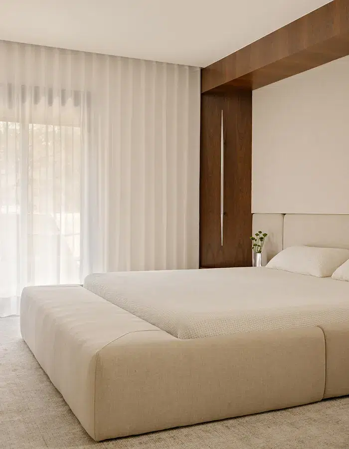 Dans la suite parentale, un portique en bois encadre le lit et intègre des tables de chevet en travertin. Les textures se répondent dans une harmonie monochrome propice au repos.