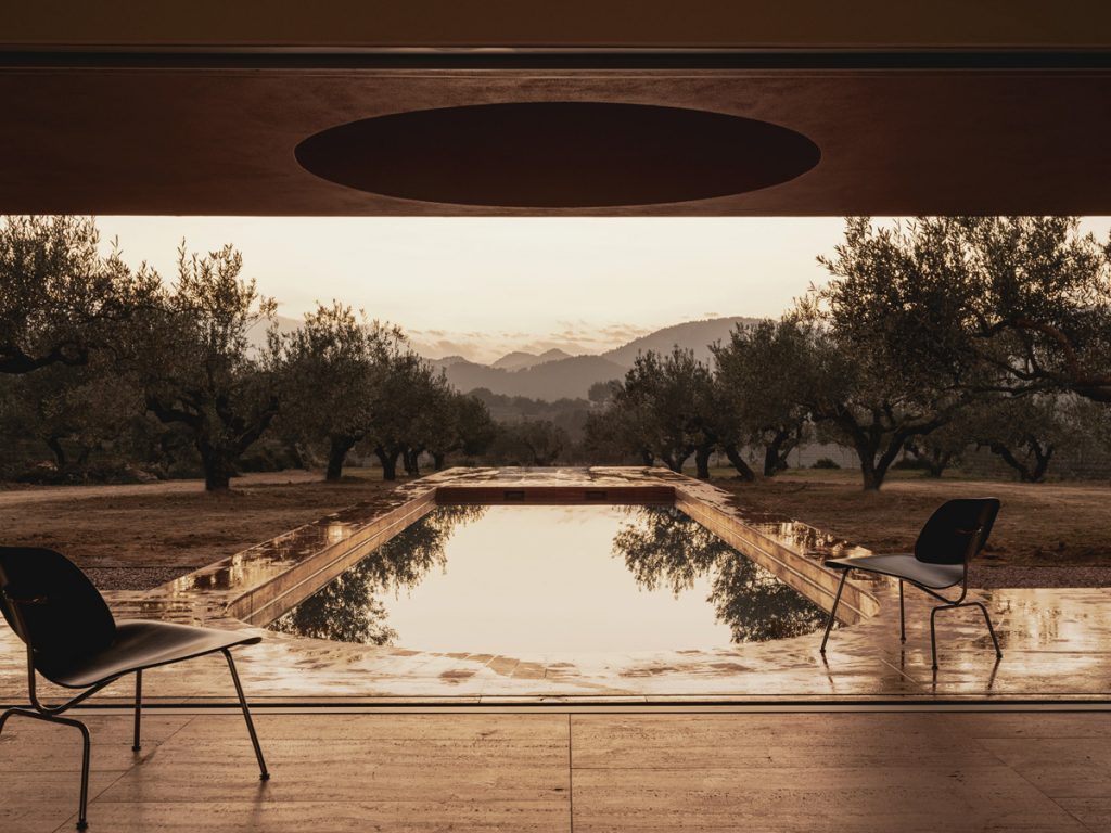 Les propriétaires, originaires de Barcelone, sont de retour sur les terres après y avoir passé plusieurs étés pendant leur enfance. « La parcelle sert de trait d’union entre l’urbain et le rural », explique le cabinet d’architecture espagnol, précisant : « C’est le dernier bosquet d’oliviers constructible à la périphérie de la commune. » Une véranda, typique de la culture méditerranéenne, protège de la chaleur de l’ouest et fonctionne comme un relais entre l’intérieur et l’extérieur. Une terrasse avec piscine s’étend dans l’oliveraie et offre des vues spectaculaires sur le coucher du soleil.