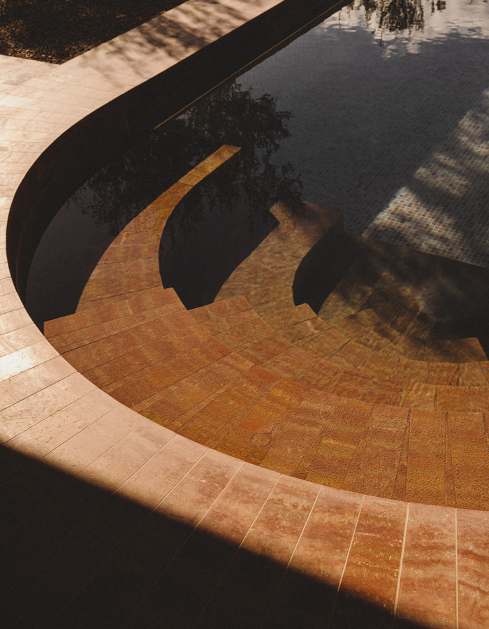 De grandes baies vitrées relient l’entrée, le jardin et les cours aux espaces intérieurs. Quant à la chambre, avec ses douches et salles de bains respectives, elle est connectée à l’extérieur par deux cours privées. L’eau se fait d’ailleurs omniprésente entre la piscine extérieure, de forme semi-circulaire, et celle intérieure avec spa, dotée de grandes fenêtres. Tout comme les matières et les textures, entre les marbres exotiques, le travertin iranien, le laiton et les menuiseries vert olive. La Casa en los Olivos parachève son innovation avec sa charpente métallique inspirée de la technique de construction « balloon frame » répandue aux États-Unis, et son concept de maison passive pour de faibles besoins énergétiques.