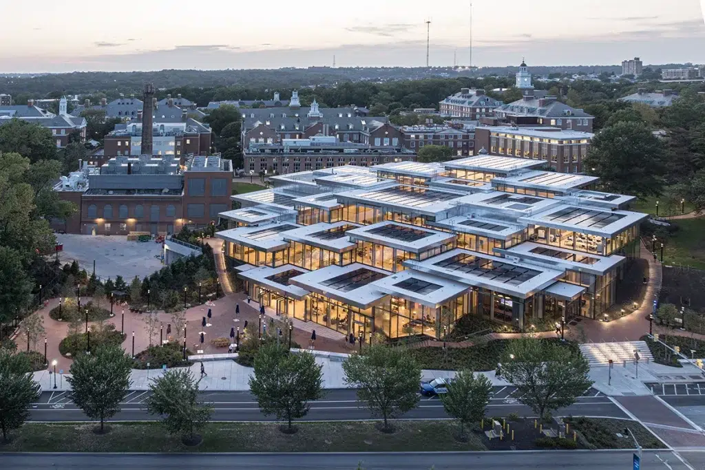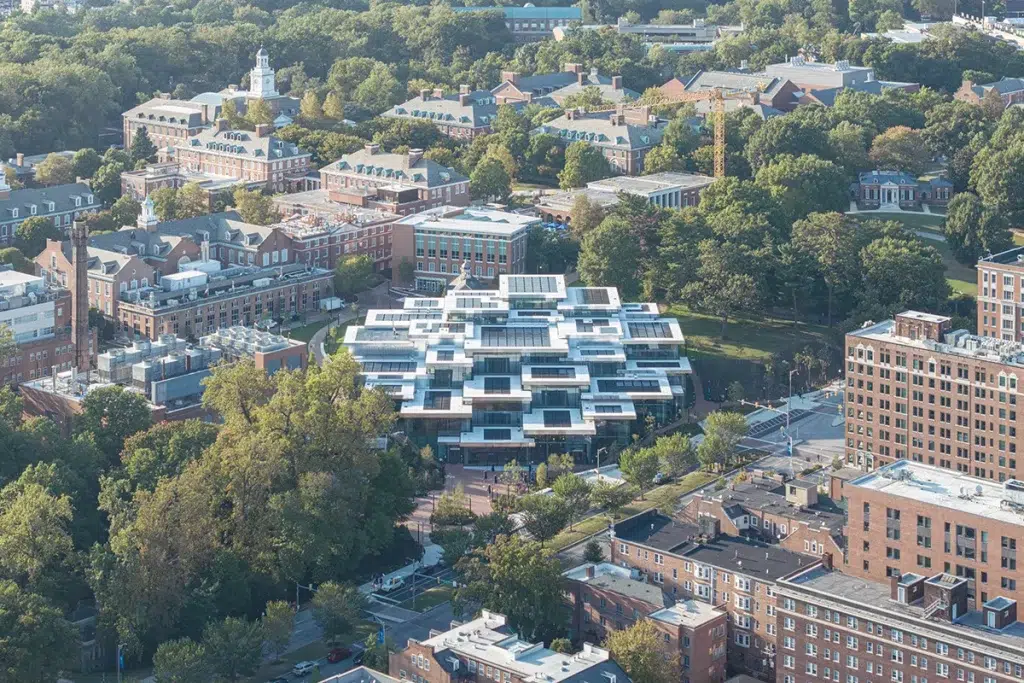 À l’angle de la 33e rue et de Charles Street, là où le campus historique de Homewood rencontre la ville, une topographie devient architecture. Sur une parcelle en pente de près de 9 mètres, le Bloomberg Student Center déploie ses 150 000 m² comme un petit village de 29 pavillons en bois massif, posés en cascade et coiffés de larges toitures planes en porte-à-faux. Sous ces toits, près de mille panneaux photovoltaïques produisent environ la moitié de l’électricité du bâtiment. L’intention est claire : faire de la convivialité étudiante un manifeste spatial et climatique.