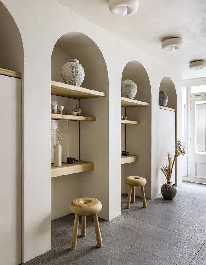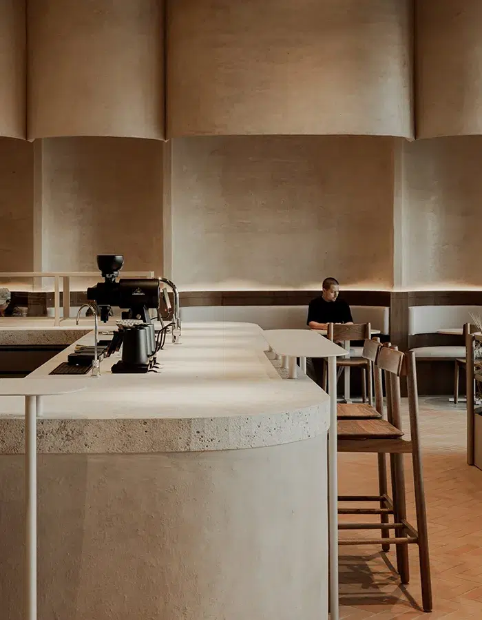 À Madrid, la boulangerie Fu.Ba (raccourci de Future Bakery) se transforme en grotte monochromatique. Les nuances douces de cet espace permettent de se rendre compte du travail fait à partir d’une matière naturelle : un bloc de roche se tient au centre de la pièce. Il est scindé en deux par une table en acier inoxydable, et les murs recouverts d’une couche de chaux créent une harmonie parfaite dans ce lieu. L’équilibre entre la matière, le futurisme et le minimalisme traduit une ambiance primitive et pragmatique.
