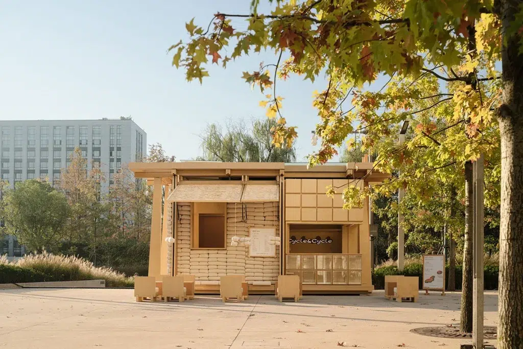 En Chine, à Hangzhou, le studio de design F.O.G. Architecture a conçu un café-boulangerie mobile construit à partir de sacs de blé remplis et empilés. Cycle Cycle est une structure mobile inspirée d’une grange traditionnelle et qui rappelle l’architecture rurale chinoise. L’objectif est de connecter avec les gens en s’adaptant à un environnement temporaire. Une vision qui convient parfaitement au concept de boulangerie pour les caractéristiques pratiques et universelles de cette dernière.