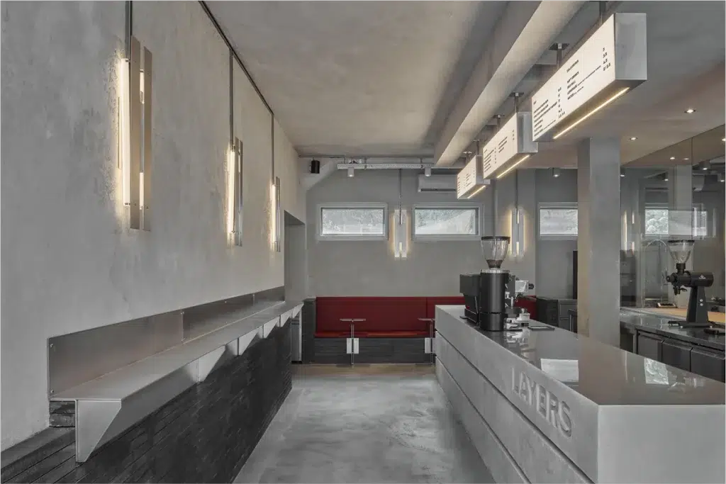 À Amsterdam, la boulangerie Layers se transforme en vaisseau spatial, entre structures brutalistes et couleurs aux tons futuristes. L’architecture audacieuse du lieu casse totalement les codes traditionnels d’une boulangerie artisanale. L’atmosphère froide et minimaliste contribue à créer une expérience immersive qui sollicite le goût, la vue et l’ouïe.