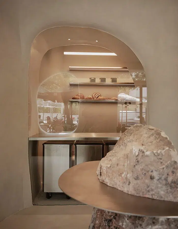 À Madrid, la boulangerie Fu.Ba (raccourci de Future Bakery) se transforme en grotte monochromatique. Les nuances douces de cet espace permettent de se rendre compte du travail fait à partir d’une matière naturelle : un bloc de roche se tient au centre de la pièce. Il est scindé en deux par une table en acier inoxydable, et les murs recouverts d’une couche de chaux créent une harmonie parfaite dans ce lieu. L’équilibre entre la matière, le futurisme et le minimalisme traduit une ambiance primitive et pragmatique.