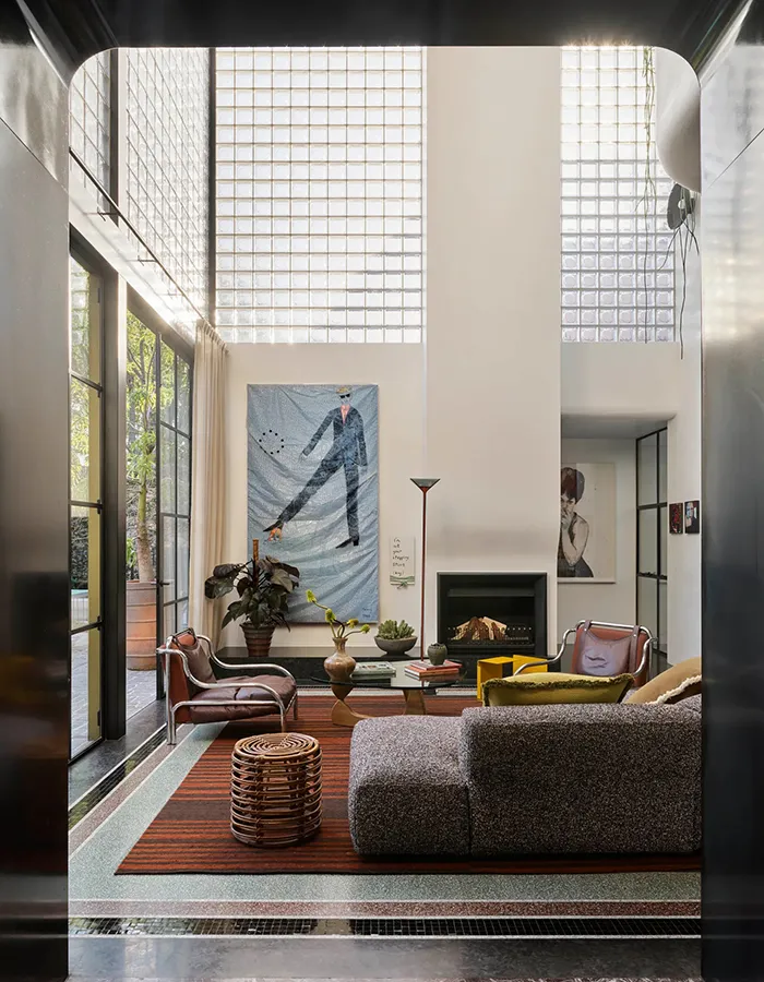 Un site qui était perçu par les deux créatifs comme une véritable toile vierge. « L’inspiration pour ce projet est venue du Grand Salon d’Yves Saint Laurent, rue de Babylone à Paris. Nous souhaitions élaborer un langage de conception authentique, équilibrant les références Art déco avec les années 1960 et le modernisme des années 1970. […] Le salon spacieux est un espace social, un lieu où les invités peuvent se réunir dans un environnement chaleureux et détendu. Ici, nous avons rassemblé un mélange de meubles de collection du XXe siècle, complétés par une collection éclectique de sculptures, d’objets de famille et de livres d’art, conférant une atmosphère singulière. » L’espace spectaculaire est équipé de chaque côté par d’étroites lucarnes sur toute la longueur des murs pour laisser entrer la lumière du jour dans le bâtiment.