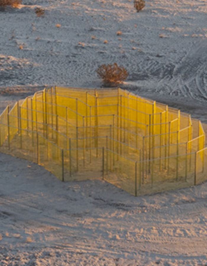 De son côté, Gerald Clarke s’inspire de ses origines et exprime des idées traditionnelles sous des formes contemporaines. Professeur d’université, cow-boy et chef tribal cahuilla, l’artiste crée ici Immersion, une sculpture semblable à un jeu de plateau dans le désert. Il se réfère à l’influence que les jeux peuvent avoir sur les gens pour acquérir des connaissances. Il mixe l’univers de la vannerie des Cahuillas et les jeux de société américains, invitant les visiteurs à se déplacer dessus selon les instructions d’un jeu de cartes. À travers sa structure en forme de labyrinthe, il plonge ainsi le public dans l’histoire naturelle et culturelle des Amérindiens.