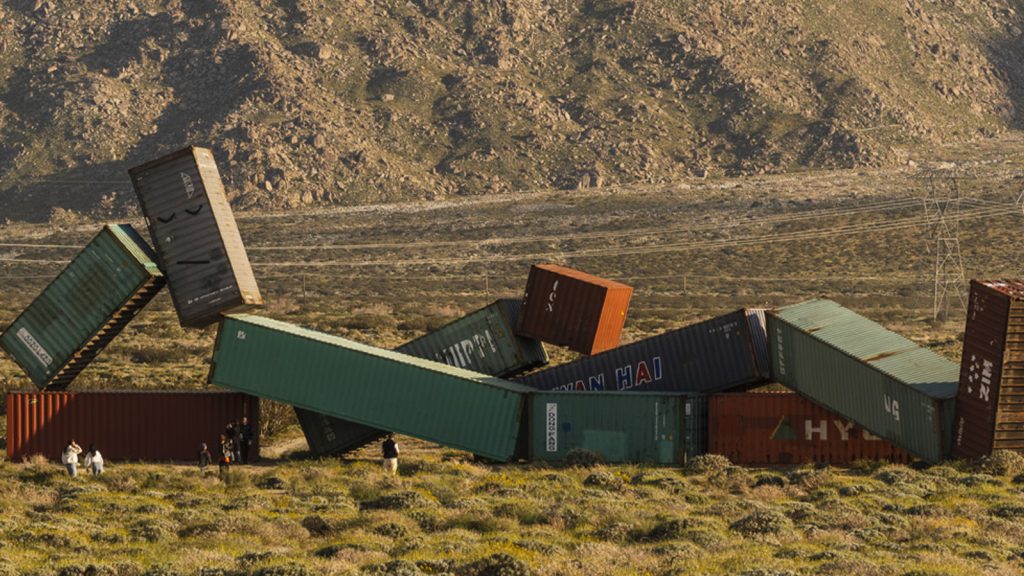 Quant à Matt Johnson, il témoigne avec Sleeping Figure des déformations et des ruptures des chaînes d’approvisionnement. Son ironie, volontaire, est que la sculpture a été conçue au moment où « un mastodonte de conteneurs japonais, exploité par des Taïwanais, géré par des Allemands, battant pavillon panaméen et piloté par des Indiens, s’est retrouvé pendant six jours sous la juridiction égyptienne, tout en bloquant le canal de Suez ». Située le long de l’artère principale reliant le port de Los Angeles à l’intérieur des États-Unis, l’installation surplombe ainsi le paysage, rappelant que « la main invisible du mondialisme, désormais connectée à son corps-conteneur, s’est posée dans la vallée de Coachella ».