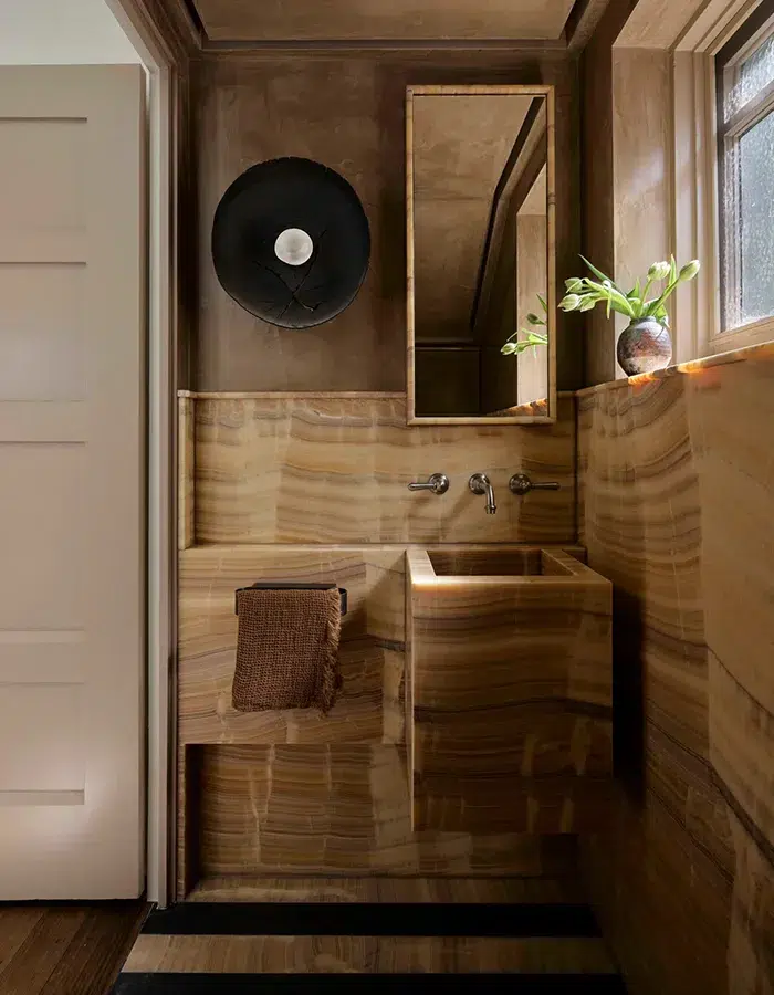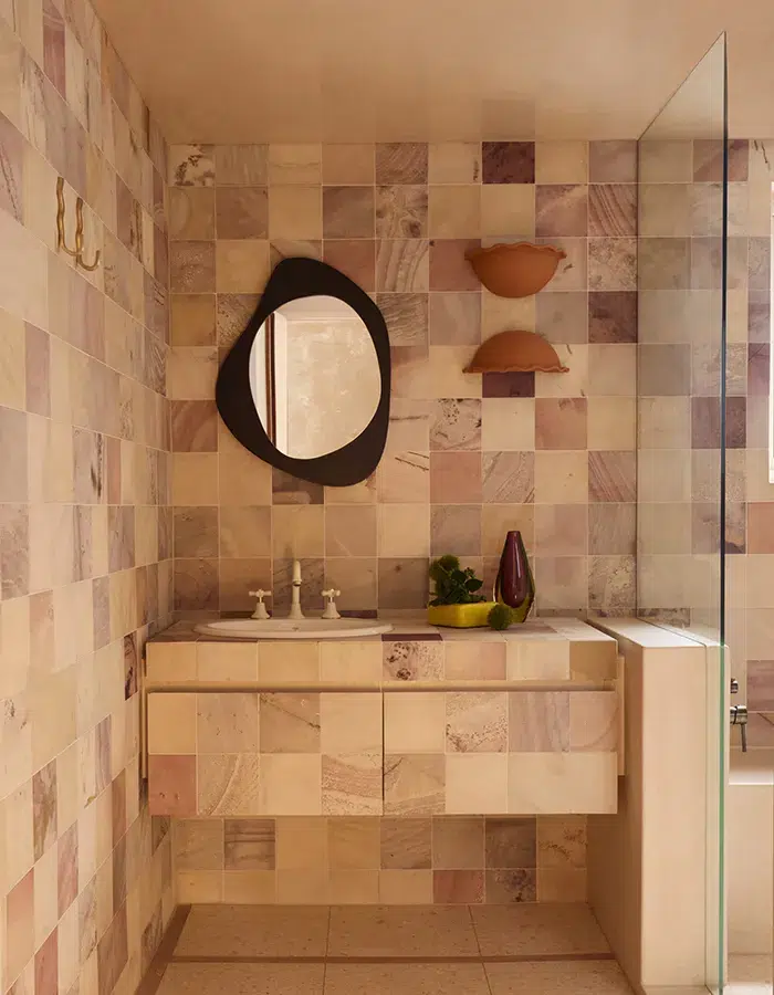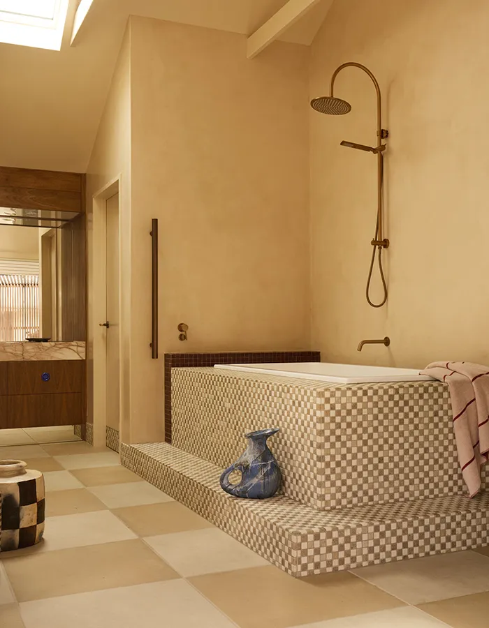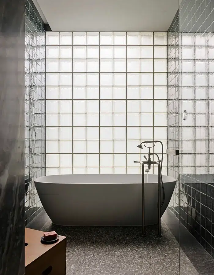 La première salle de bain est entièrement décorée de carreaux vernis sur lesquels se reflète la lumière qui entre à travers des briques de verre. La baignoire installée au centre de la pièce créée une ambiance mélancolique et un style épuré. Si ce lieu nous semble être un refuge parfait, la seconde salle de bain fait naître des souvenirs d’été, entre la mosaïque sur la baignoire et les couleurs chaudes de la grande pièce. Le style haut de gamme et singulier de cette baignoire s’inspire d’archives italiennes, évoquant le design des bains thermaux de la cité antique de Pompéi avant qu’elle ne soit détruite.