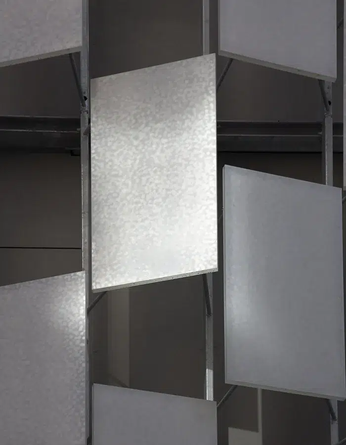 Là encore, l’ingénierie n’est jamais dissociée du sens. Structure provisoire par définition, l’échafaudage devient ici un motif conceptuel. Il évoque l’inachèvement, le processus, la construction permanente. Modulable, adaptable selon les lieux d’installation, l’œuvre se transforme sans se répéter. Le vitrail, traditionnellement synonyme de fixité et de durée, se trouve déplacé vers une logique de mouvement et de transformation. Dix pour cent du verre utilisé est issu du réemploi, inscrivant l’œuvre dans une réflexion contemporaine sur les ressources et les cycles de la matière.