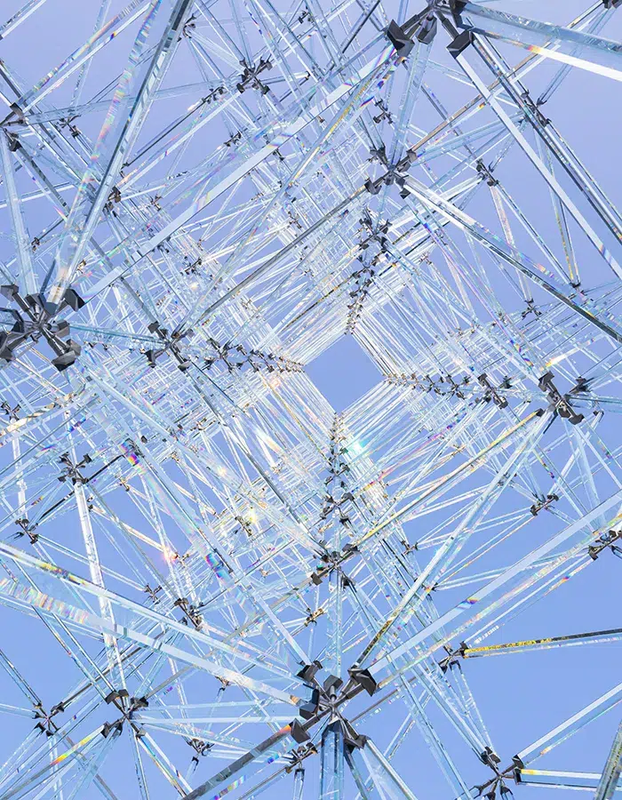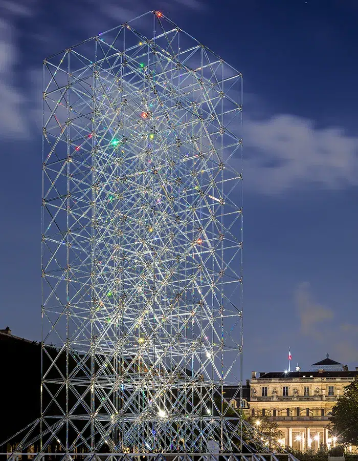 Avec Réflexions, œuvre profondément personnelle présentée dans le jardin du Palais-Royal à Paris en 2023, Emmanuel Barrois pousse cette logique encore plus loin. Monumentale, l’installation se compose de 8 tonnes de verre et de 6 000 mètres de prismes entremêlés, formant le premier échafaudage de verre de cette envergure au monde. Derrière l’évidence formelle se cache une prouesse technique : un système de petites étoiles d’inox, de nœuds discrets combinant fixation mécanique et collage, permettant de maintenir les barres de verre tout en garantissant une résistance à des vents de plus de 100 kilomètres-heure.