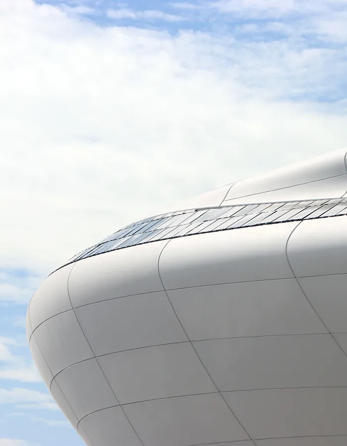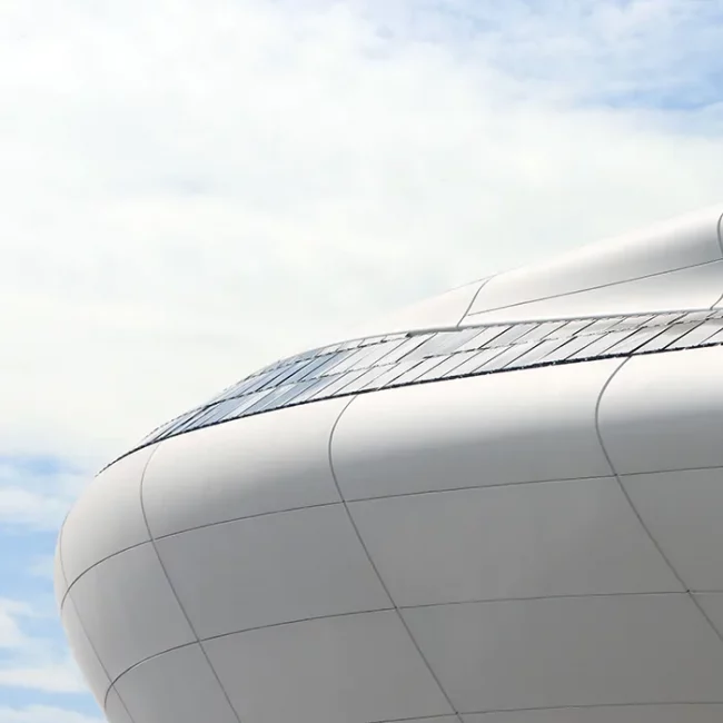 La toiture, coque de béton à double courbe couverte de milliers de tuiles de zinc façonnées à la main, évoque à la fois l’écaille d’un dragon et les ondulations de la mer. Cette peau métallique réfléchit la lumière changeante, faisant vibrer la maison au rythme des vagues. L’ambiguïté entre nature et artifice, voulue par les architectes Pablo Gil et Jaime Bartolomé, inscrit la construction dans un dialogue poétique avec son paysage.