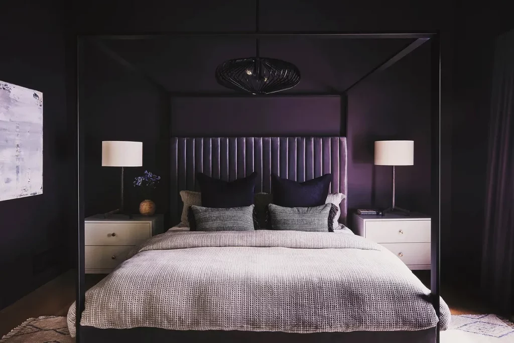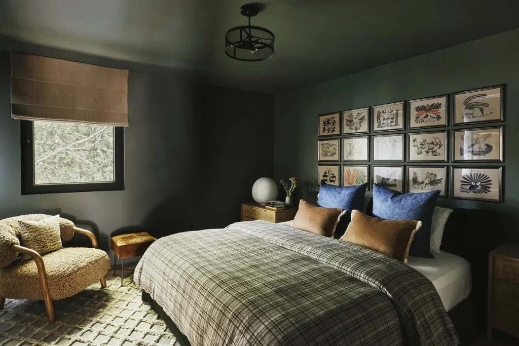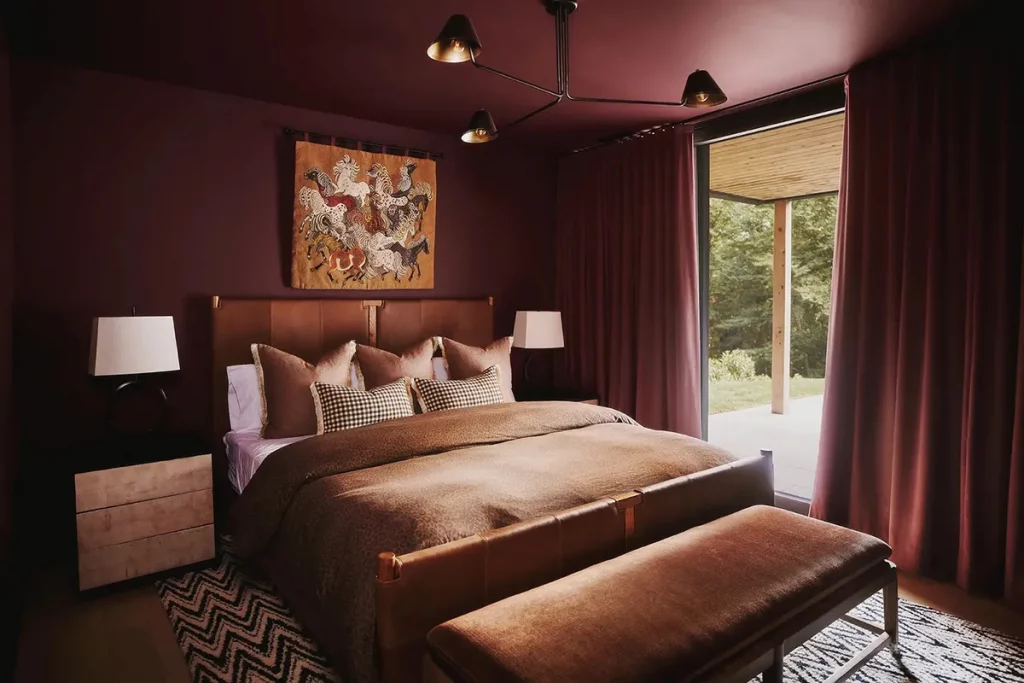 Les chambres d’amis expriment chacune une identité chromatique forte. À l’étage, un vert profond enveloppe les murs et met en valeur des estampes canadiennes disposées au-dessus du lit. Une lampe en porcelaine posée sur un chevet en bois de manguier apporte une douceur presque poétique à la composition. Au niveau jardin, la suite adopte un rouge riche et enveloppant. Un tapis marocain tissé à la main habille le sol, tandis qu’une tapisserie vintage représentant des chevaux surplombe un lit en bois et cuir, insufflant à la pièce une dimension narrative et chaleureuse.