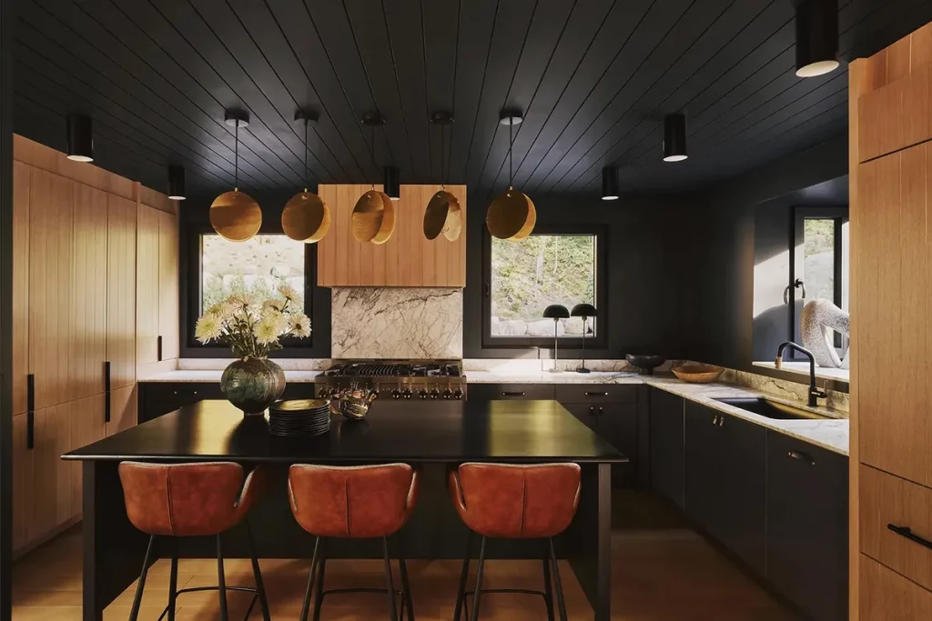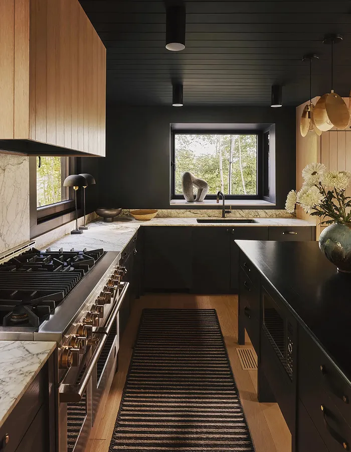 Dès la cuisine, l’intention est manifeste. L’espace, largement ouvert sur l’extérieur, est rythmé par un plafond en lames de bois qui réchauffe immédiatement l’atmosphère. Les suspensions en laiton massif au-dessus de l’îlot central ne sont pas de simples luminaires : elles agissent comme des sculptures suspendues, captant la lumière et la diffusant en reflets dorés sur les plans de travail en marbre veiné. Le contraste entre le noir profond des éléments de menuiserie et la douceur minérale du marbre crée un équilibre sophistiqué. Dans la fenêtre de l’atrium, juste au-dessus de l’évier, une sculpture d’un artiste canadien introduit une note curatoriale subtile, transformant un point fonctionnel en scène artistique.