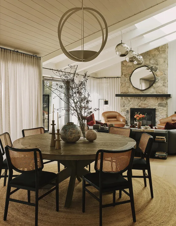 Le salon et la salle à manger cultivent une élégance enveloppante. Le manteau de cheminée en granit de carrière affirme une présence minérale forte, ancrant l’espace dans une matérialité brute et résolument locale. Au-dessus de la table ronde, un lustre métallique diffuse une lumière indirecte vers le plafond, créant une ambiance intime presque théâtrale. Les assises en cannage noir et les cuirs patinés dialoguent avec des textiles texturés, soigneusement choisis pour leur profondeur tactile. Le canapé sur mesure, habillé d’un tissu effet shearling, invite littéralement à s’y lover. Chaque coussin, chaque plaid semble avoir été sélectionné pour composer une partition de tons naturels, brun tabac, beige sable, vert mousse, en écho à la forêt environnante.