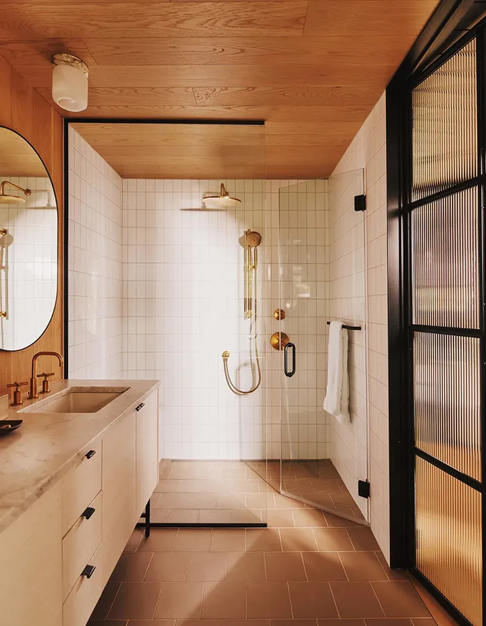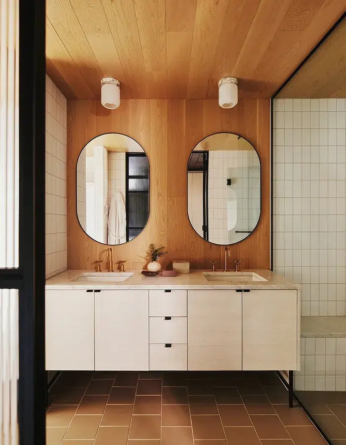 La salle de bains attenante révèle une approche presque tactile du design. Les murs et le plafond habillés de bois massif créent un cocon chaleureux. Deux miroirs circulaires suspendus au-dessus d’un meuble sur mesure en bois massif introduisent une symétrie apaisante. Les portes métalliques personnalisées avec verre cannelé apportent une touche graphique contemporaine, tandis que le sol en carreaux d’argile contraste délicatement avec les parois blanches de la douche. Les robinetteries, aux finitions chaleureuses, ponctuent l’ensemble d’éclats précieux.
