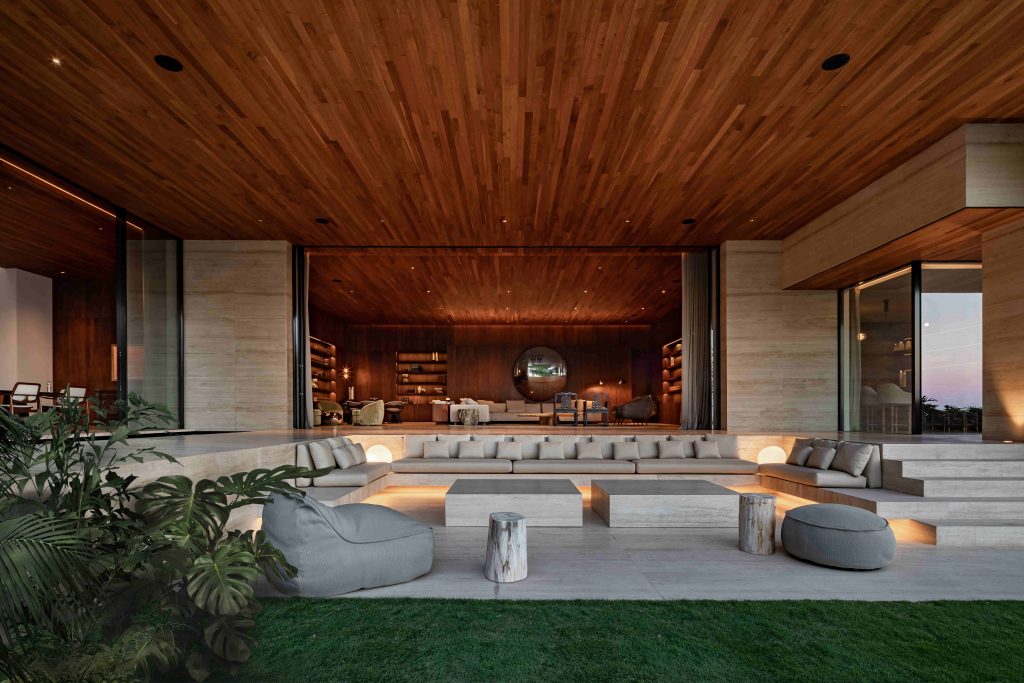 La Stone House (Casa de Piedra), nichée sur une colline, offre une vue panoramique sur Monterrey. Volume des espaces, géométrie et chevauchement des murs, reflets et sons des plans d’eau constituent cette maison moderniste développée sur un seul étage et recouverte d’un toit en noyer. Elle est l’œuvre du cabinet d’architecture Taller ADG, basé à Mexico, qui a collaboré avec l’architecte d’intérieur Micaela de Bernardí. Ensemble, ils se sont inspirés du travail de Luis Barragán à travers une synthèse de l’espace, de la lumière et des matières, avec ces plafonds en bois qui rendent hommage aux traditions vernaculaires du Mexique. Au centre de la demeure se trouve une grande cour, avec une fontaine, des magnolias et une sculpture de l’artiste chinois Ai Wei Wei, générant un environnement subtil propice à la contemplation. Les fluctuations du climat de la région se reflètent également dans le choix des matériaux : le travertin clair et frais contraste avec la chaleur du bois.