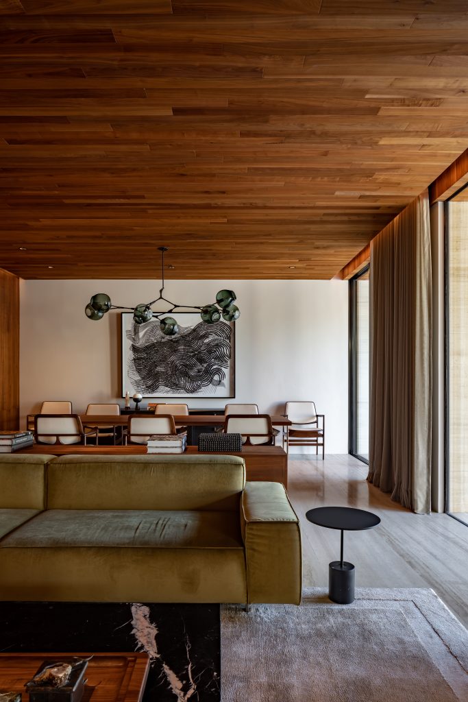 L’équipe de conception a maintenu une palette de couleurs lumineuses et uniformes dans un ton similaire au marbre et à celle de l’architecture. Pour garder une lumière naturelle zénithale, des lucarnes ont été installées. À l’intérieur, la circulation reste fluide, grâce à des portes coulissantes dissimulées et à des meubles placés le long des axes. L’entrée se fait par un hall éclairé naturellement qui mène successivement à un salon, une salle à manger, un bar et une terrasse pourvue d’un grill pour les soirées en plein air. La maison dispose également d’une salle de réunion intimiste qui donne sur un patio, puis sur un jardin avec des vues sur la ville mexicaine. Non loin de là se trouvent la cuisine et toute la partie privée, laquelle comprend une salle familiale reliée à la chambre principale par une cour intérieure, deux autres chambres, une salle de sport et un bureau. L’art s’épanouit au cœur de l’habitation, avec des œuvres de Rufino Tamayo, Anish Kapoor, Anselm Kiefer et Giuseppe Penone. Quant au mobilier, c’est un mélange de meubles anciens et de pièces de designers du XXe siècle (Hans J. Wegner, Warren Platner) et contemporains (Vincenzo de Cotiis, Lindsey Adelman). La Stone House célèbre ainsi l’architecture émotionnelle en lumière, fusionnant avec l’aspect minimaliste propre au mouvement moderne.