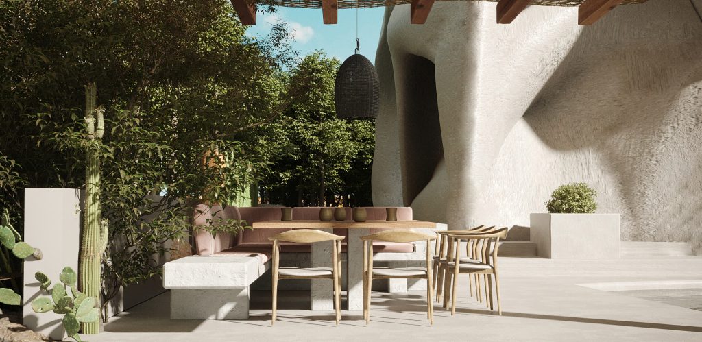 Mohamed Badie, fondateur de ce cabinet d’architecture basé au Caire, fait fi des codes établis pour créer une connexion directe avec le monde naturel. Intemporelle, organique, complexe… Tels sont les maîtres mots qui caractérisent cette conception architecturale dépourvue de toute ligne parallèle. « Il ne s’agit pas ici d’imiter la nature, [mais plutôt de] transmettre son message », explique l’architecte. Visant « à redéfinir les expériences spatiales et donc les comportements humains, tout en rompant avec les paradigmes conventionnels », le cabinet a créé un dialogue subtil entre l’habitation humaine et le monde naturel, en utilisant un vocabulaire visuel sauvage : « Cela peut paraître une forme d’abandon notoire de l’ordre, mais il s’agit en fait de se soumettre au flux aléatoire de la nature, de lâcher des contraintes artificielles et de rejoindre sa danse gracieuse de formes dans un mouvement qui se situe quelque part entre réalisme et idéalisme. »