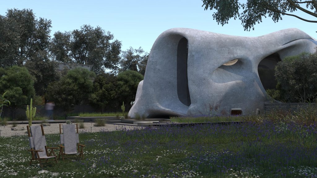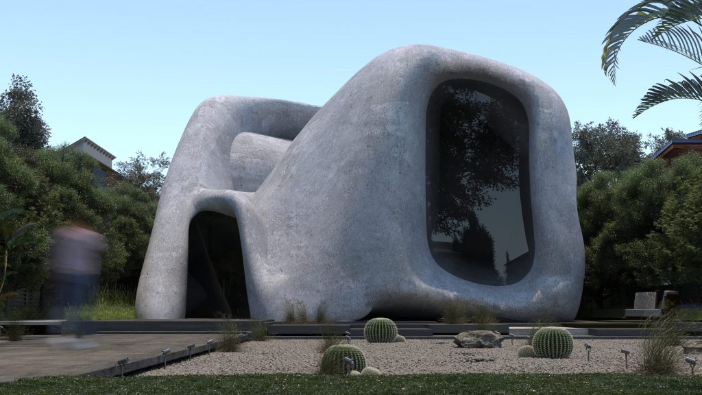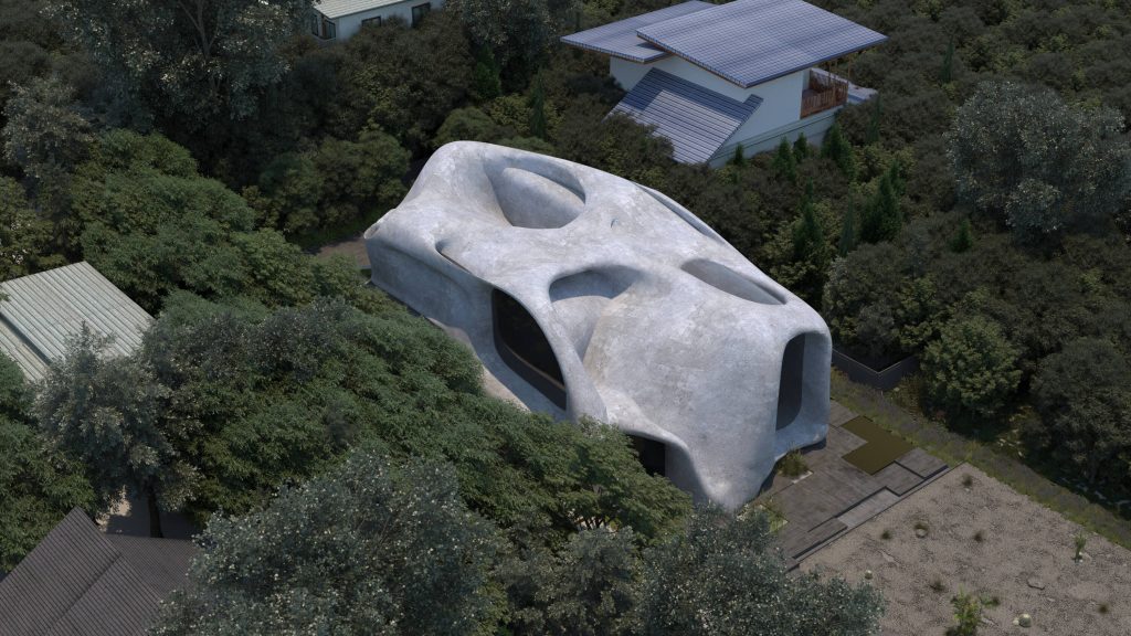 Selon la demande de son client, qui souhaitait « une maison originale échappant au plan typique en boîte », cette structure prend des allures de caverne luxueuse, utilisant des lignes inégales et ondulantes, avec de grandes fenêtres. L’équipe de conception a eu recours aux progrès de l’informatique et aux technologies innovantes pour numériser cette idée complexe, en évitant les lignes parallèles pour former une série de vides et de solides : « Cela a permis de construire une gamme variée de formes naturelles avec une grande facilité. » Ce projet prend ainsi en compte les dimensions physiques, psychologiques et sociales, préserve les éléments de l’environnement et se concentre sur le bien-être mental et émotionnel fourni par l’espace. Si le béton est utilisé comme matériau de finition extérieure, la demeure tire son design de son ossature « gaufrée », complétée par de la fibre de verre, apportant une vision intemporelle issue de la nature sous toutes ses formes.