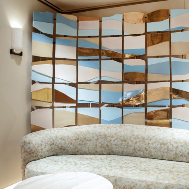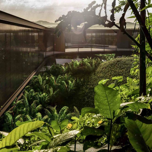 La géométrie rigoureuse des trois résidences embrasse ainsi le paysage aride, adouci par la végétation indigène. Ces parallélépipèdes créent un véritable contraste visuel organique face à l’extrême verticalité de la mésa brute si typique de l’Ouest américain. Elles offrent à la fois de l’intimité et des vues cadrées sur le panorama désertique. La structure entre plâtre, pierre et béton local se fond pleinement dans le décor. « À l’extérieur, les passants ne remarqueront peut-être même pas l’existence des maisons », explique Joseph Dangaran. Quant aux intérieurs décloisonnés, de 3 m sous plafond, ils laissent généreusement entrer le soleil, qui inonde les habitations au style brutaliste doux à travers les atriums, les lucarnes et les ponts aériens en verre. L’ensemble est sublimé par une piscine à débordement tout en longueur, invitant au bien-être et à la convivialité en plein air.