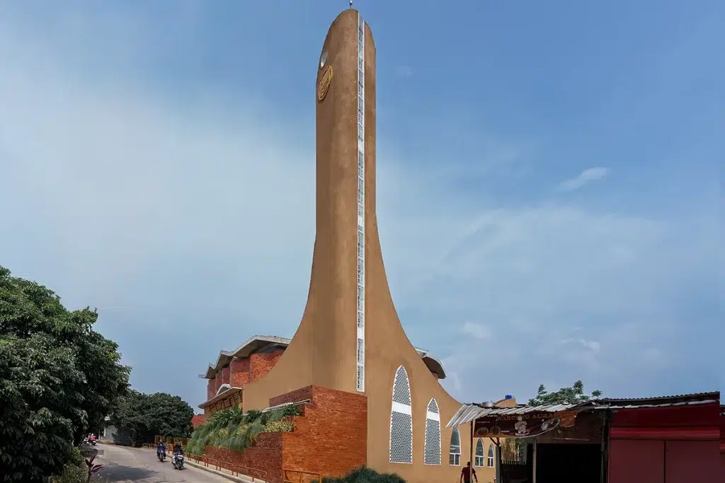L’œil, d’abord, est saisi par la douce étrangeté de la forme. Les façades plissées semblent s’incliner, se replier sur elles-mêmes, dans un mouvement que l’on devine inspiré de la prosternation. Le pli, ici, n’est pas un artifice formel mais une métaphore habitée : celle de la sujétion du croyant à Dieu, traduite à l’échelle du bâti. Ce jeu de tension entre verticalité et inclinaison fait naître une architecture du recueillement, où chaque angle devient un geste de dévotion.