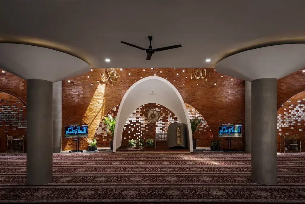 À l’intérieur, la lumière devient le véritable ornement. Elle filtre à travers les interstices du pli, se faufile le long des parois, caresse les surfaces rugueuses. Lorsque le Soleil est au zénith, elle dépose des fragments d’éclat sur le sol destiné à la prière ; au crépuscule, elle se dissout dans les nuances orangées de la brique. C’est une lumière vivante, une respiration du lieu, qui fait de chaque instant une expérience spirituelle renouvelée. L’espace ne se contente pas d’accueillir la prière : il la sculpte, la rend palpable.