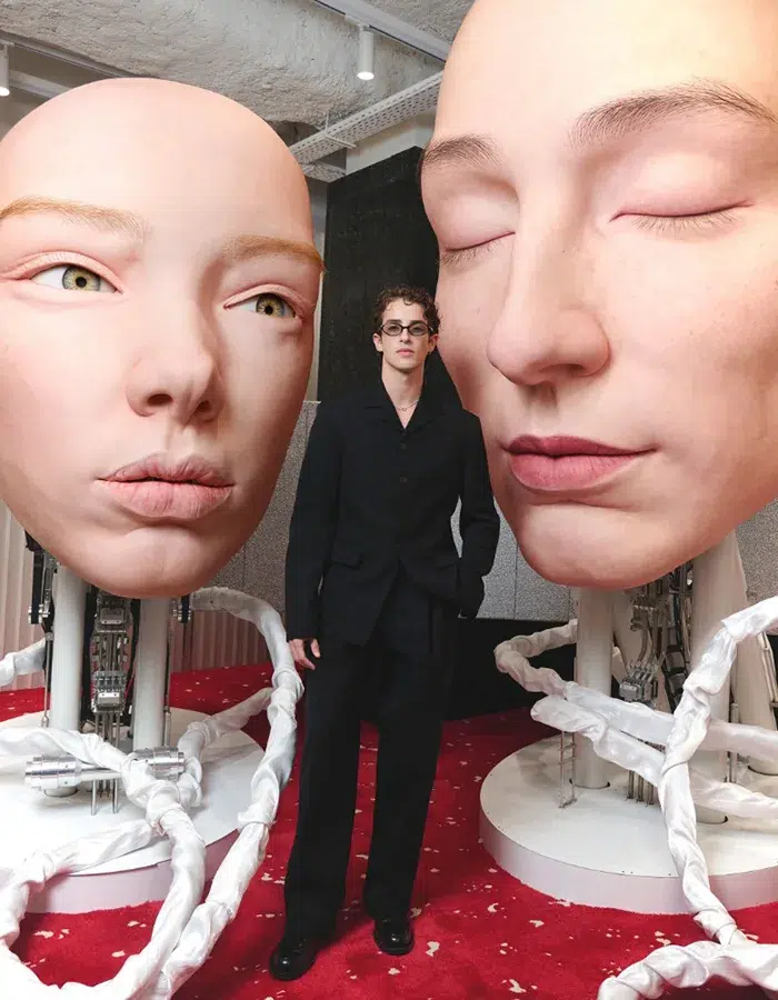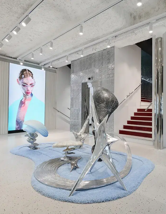 Dans ce quartier historique, réputé pour être un haut lieu de l’avant-garde de la mode, Gentle Monster ne passe pas inaperçu grâce à ses grandes vitrines et à son installation intrigante, parfaitement cohérente avec sa philosophie futuriste. « Giant Head Kinetic Object » est le nom de cette œuvre composée de trois visages hyperréalistes, animés par un mécanisme invisible. Le visage central ferme les yeux et hoche la tête, tandis que les deux autres se déplacent subtilement à ses côtés. Ils incarnent chacun l’une des trois valeurs de la marque : perception, contemplation et cognition.
