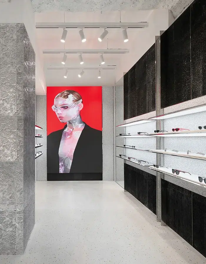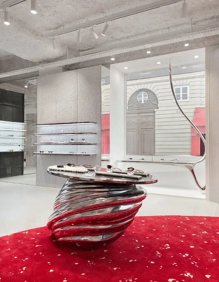 À l’étage, l’objet STAR se veut expérimental : il capte la lumière du soleil et reflète celle du soleil levant. On en oublierait presque que ce lunetier haut de gamme propose aussi des lunettes au style futuriste et avant-gardiste.