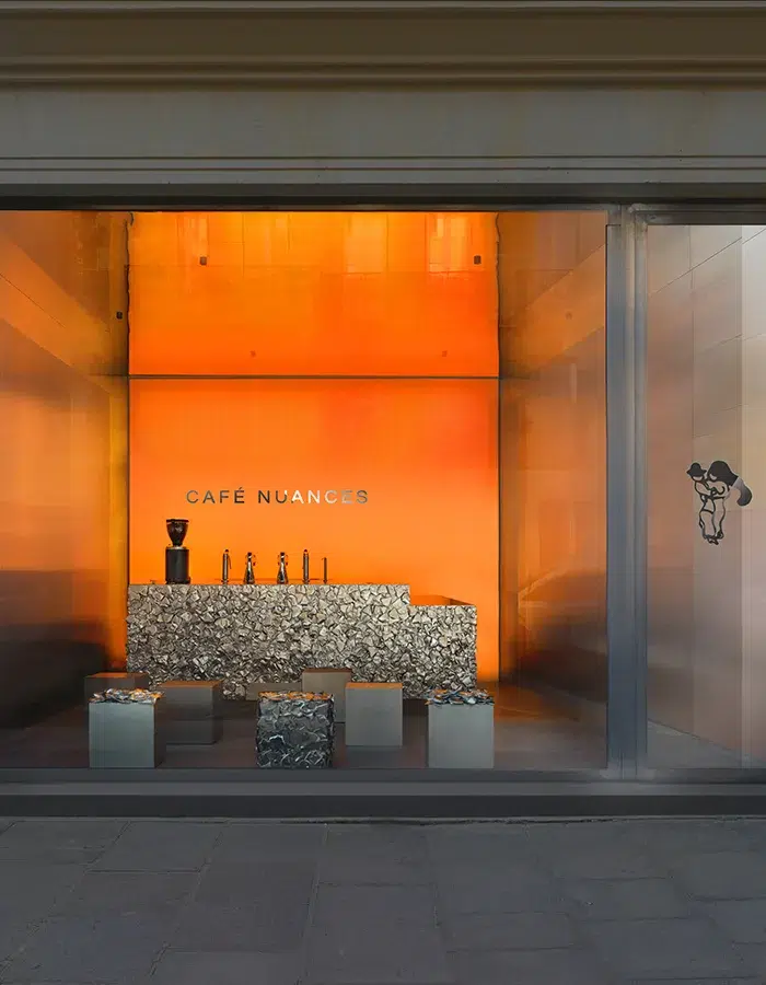 Au 51, rue des Francs-Bourgeois, en plein cœur du Marais, Café Nuances impose sa présence avec un minimalisme incandescent. Conçu par Harry Nuriev du Crosby Studios, le lieu s’inspire du nouveau réalisme. Les murs se parent d’un orange vibrant qui se module au fil de la journée, tandis que les assises et comptoirs évoquent le plissé singulier de gobelets compressés. Ici, le design est matière première : inox et lumière saturée créent une scénographie où le latte choco-coco ou le matcha au jasmin deviennent partie prenante de l’espace. Plus qu’un coffee shop, c’est une installation urbaine, où l’on savoure autant l’esthétique que les boissons.