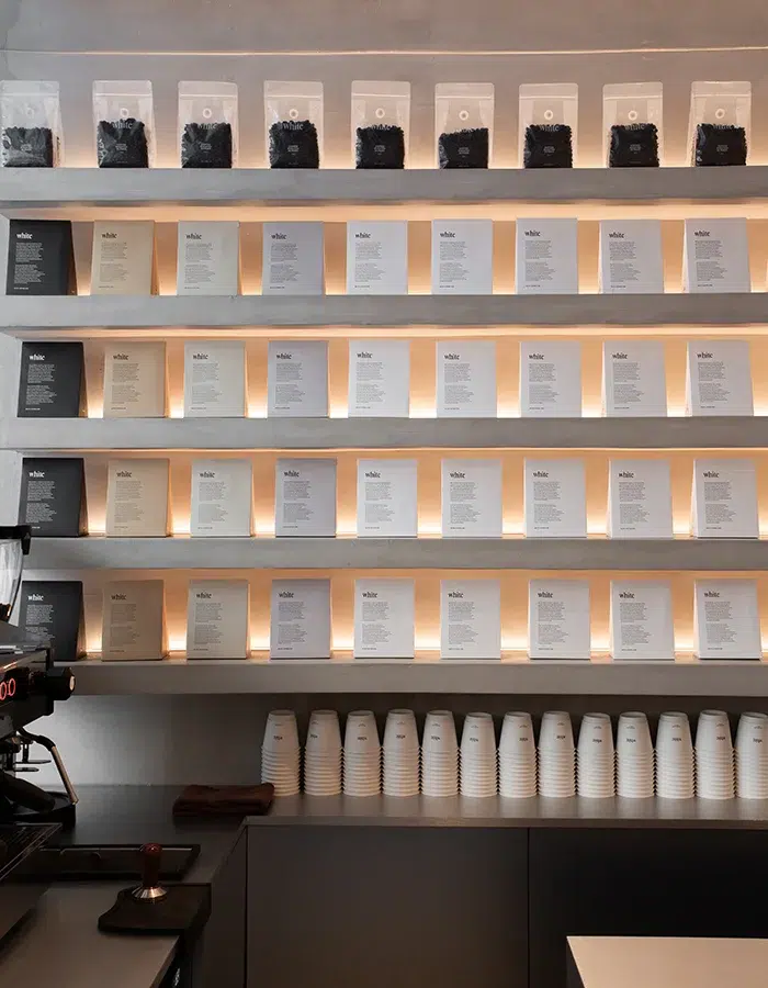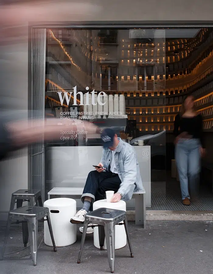 Fondés par Jenny Martin et Étienne Ryckeboer, les cafés White ont choisi une esthétique radicale : un minimalisme brut, pensé comme un territoire d’expression. Dans les adresses du Faubourg-Saint-Denis et du Marais, les murs dénudés et les étagères répétitives composent un décor à la fois sobre et hypnotique. L’espace, volontairement épuré, met en valeur la rigueur de la torréfaction parisienne. White ne se contente pas de servir du café : il chorégraphie une expérience totale, où la précision architecturale prolonge l’exigence gustative. Ces adresses flirtent avec l’atmosphère des galeries d’art : ici, la tasse devient objet de contemplation, et chaque gorgée un rituel.