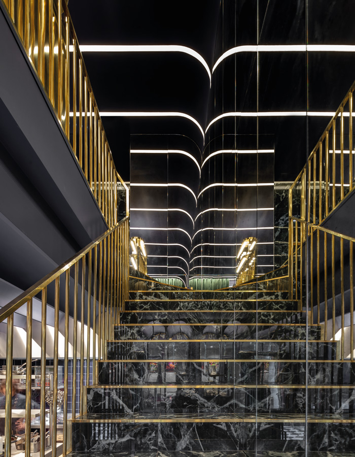 Il en va de même pour la vinothèque rétroéclairée de l’Apéro Square, servie par un grand comptoir, alliant la minéralité de l’ardoise à la chaleur du chêne naturel. Et ses projets privés ne sont pas en reste. À l’image de ce duplex de 180 m² dans le Marais. L’appartement L fait la place belle à un grand rideau de lames en bois teinté, comme s’il sublimait une scène théâtrale, scindant les espaces principaux et annexes. Les teintes gris chaud et anthracite, associées aux miroirs, au marbre et aux gorges lumineuses au plafond, parachèvent la géométrisation et la structuration de ce trésor parisien.
