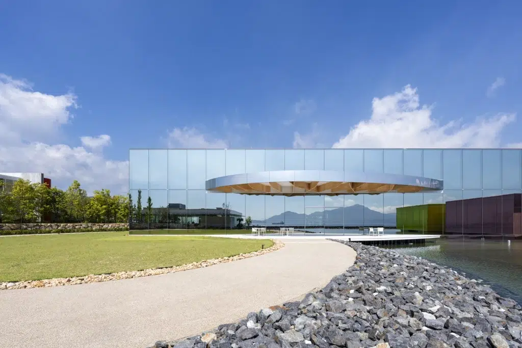 L’architecture du Simose Art Museum est aussi fascinante que son contenu. La structure du musée, avec son hall d’entrée, sa salle d’exposition et son bâtiment administratif, s’étend parallèlement à la mer. Ces espaces sont reliés par un corridor de 190 mètres de long et 8,5 mètres de haut qui forme un écran de verre à effet miroir, reflétant la beauté environnante tout en dissimulant les grands bâtiments. Derrière cet écran de verre, huit galeries mobiles, disposées sur un bassin d’eau et enveloppées de verre coloré, créent un paysage symbolique inspiré des îles de Setouchi.