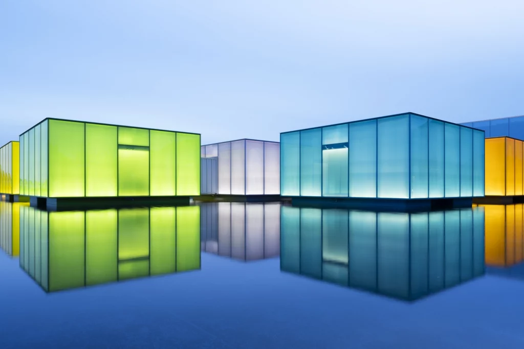 L’architecture du Simose Art Museum est aussi fascinante que son contenu. La structure du musée, avec son hall d’entrée, sa salle d’exposition et son bâtiment administratif, s’étend parallèlement à la mer. Ces espaces sont reliés par un corridor de 190 mètres de long et 8,5 mètres de haut qui forme un écran de verre à effet miroir, reflétant la beauté environnante tout en dissimulant les grands bâtiments. Derrière cet écran de verre, huit galeries mobiles, disposées sur un bassin d’eau et enveloppées de verre coloré, créent un paysage symbolique inspiré des îles de Setouchi.
