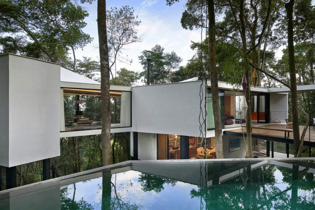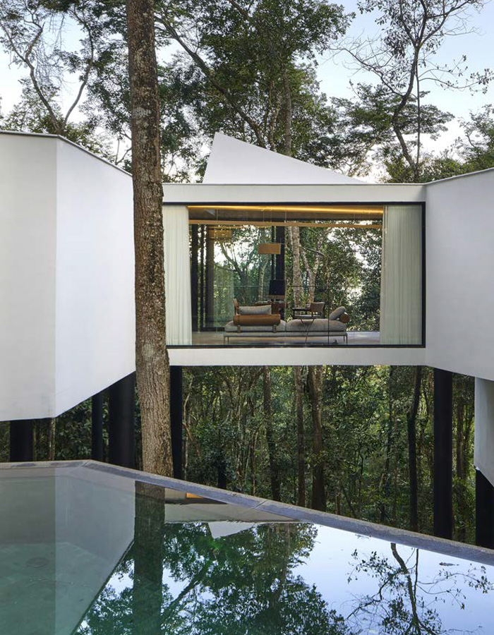 Elle semble en effet s’épanouir et flotter dans l’environnement envahi d’oiseaux et d’animaux sauvages. Perchée sur des pilotis, cette demeure de béton et de verre opale s’élève à 15 m au-dessus du sol, jouant avec la canopée des arbres en contre-plongée, tandis que la vie animale et végétale continue de se développer en dessous. Composée de différents volumes géométriques, l’architecture occupe les espaces vides entre les arbres où des piliers noirs, placés au hasard, se fondent dans les troncs. Tetro joue ainsi superbement avec les matériaux naturels, comme le plancher de la terrasse, les miroirs d’eau de la piscine et les multiples fenêtres qui reflètent la végétation comme une vue sans fin sur la nature brésilienne.