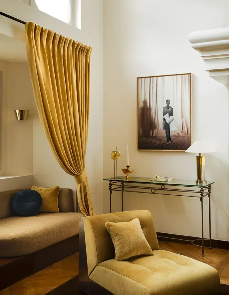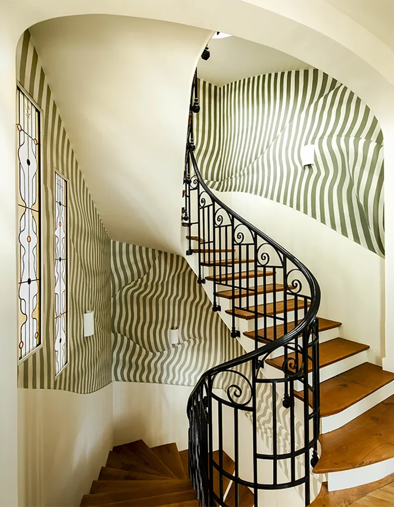 Une voix que les deux architectes d’intérieur traduisent en matières délicates et en harmonies narratives. Dès l’entrée, le ton est donné avec un escalier hélicoïdal en trompe-l’œil signé Mauro Ferreira : drapé vert émeraude éclatant, illusion textile, écho surréaliste. Le motif du rideau devient un fil rouge, que l’on retrouve dans une cheminée façonnée par Southway Studio, dans un plafond plâtré aux volumes flottants, ou encore dans les ondulations théâtrales des tissus.