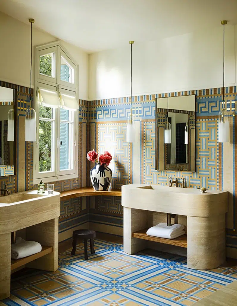 Des clins d’œil au passé musical d’André Mauprey ponctuent le parcours : une clef de fa ciselée dans la ferronnerie, des lignes de portée dans les vitraux, un rythme spatial qui guide la visite. La salle de bain principale conserve ses mosaïques d’origine, restaurées avec précision, pendant que d’autres sols ont été créés sur mesure dans un esprit néo-Art déco.