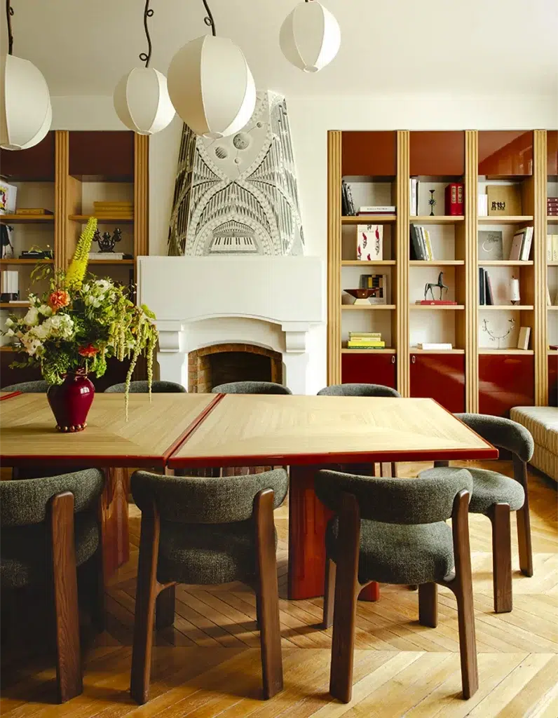 La palette chromatique est audacieuse : rouges profonds, bleus envoûtants, verts anglais, bruns veloutés. Les matières – bois laqué, velours, laiton poli, mosaïque – invitent à la caresse. La sensualité y est toujours porteuse de sens.