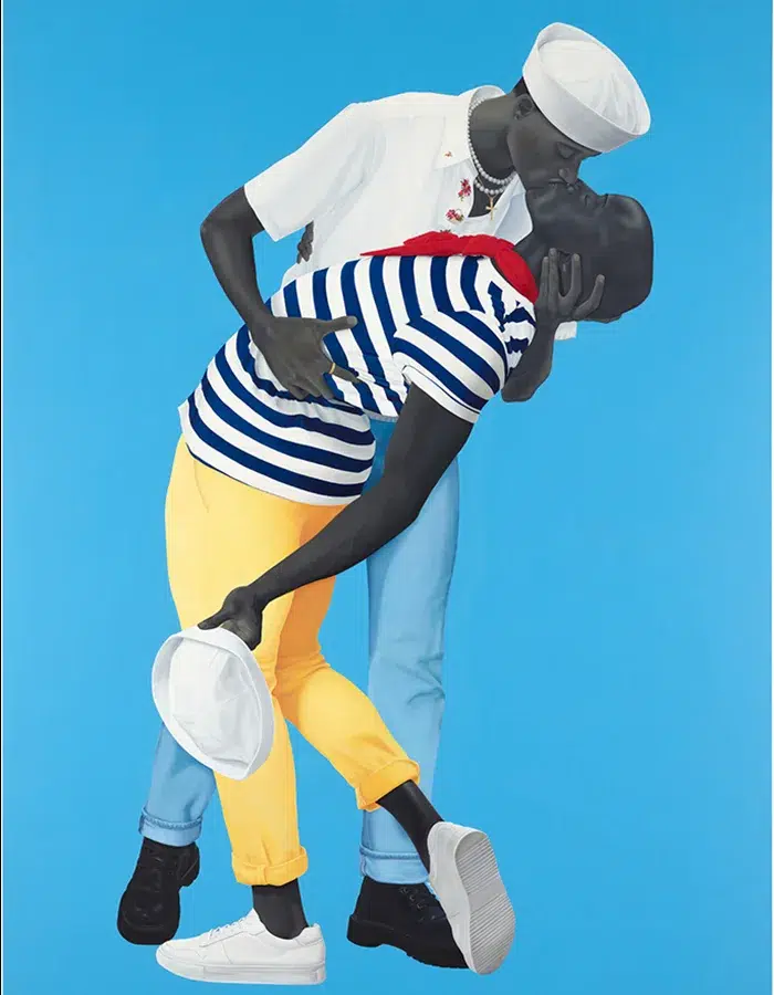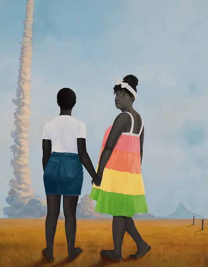 L’exposition « American Sublime », présentée d’abord au SFMOMA avant de s’installer au Baltimore Museum of Art, réunit une quarantaine de toiles réalisées entre 2007 et 2024. C’est un voyage dans une œuvre désormais culte, traversée par des silhouettes qui ne posent pas mais s’affirment. Sherald n’offre jamais de récits anecdotiques. Elle compose des présences. Sa palette, toujours précise, associe le gris iconique choisi pour la peau – ce gris qui échappe à toute catégorisation raciale – à des couleurs éclatantes, presque irréelles, qui enveloppent les vêtements, les décors ou les accessoires. L’effet est double : d’un côté, ces silhouettes semblent surgir d’un conte moderne ; de l’autre, elles nous regardent avec une sincérité désarmante.