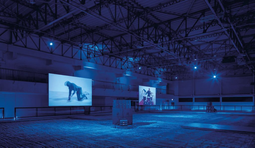 Autre installation vidéo propre à bouleverser et nos carcans et nos sens, Jester d’Anne Imhof (galeries Buchholz et Sprüth Magers) fut l’une des attractions de Basel Unlimited. Composée à partir de plusieurs performances filmées lors de son exposition « Natures mortes » en 2021 au Palais de Tokyo, cette pièce vidéo d’une heure projetée sur double écran peut apparaître comme une sorte de rêve ou d’illusion. On y voit les danseurs et performeurs évoluer dans une atmosphère crépusculaire, tantôt avec violence, tantôt au ralenti, en suivant l’intensité de la musique et en émettant parfois des cris inaudibles… Une chorégraphie heurtée évoquant l’errance et le chaos. N’est-ce pas sur les ruines que l’on bâtit un monde nouveau ?