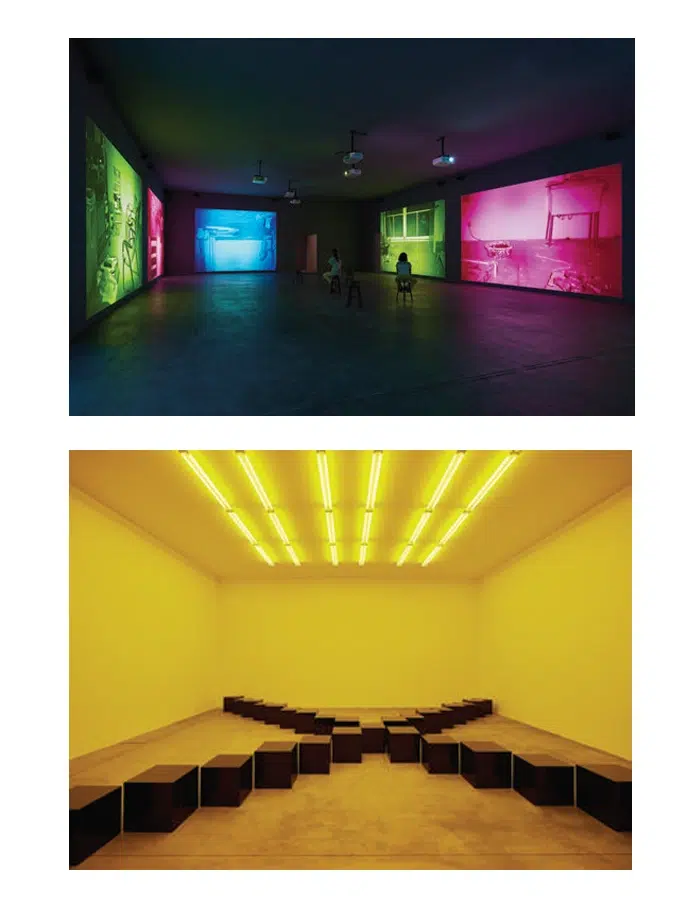 Destinées à conduire à une plus grande conscience des limites de notre corporalité, les oeuvres de l’artiste américain, consistant en des parcours à la fois physiques, sensitifs et émotionnels, sont bel et bien à arpenter et à expérimenter, et non à contempler. Cependant, Bruce Nauman est allé plus loin : réalisée à Milan en 1971 et reconstituée ici pour la première fois, Funnel Piece exploite les outils électroniques de surveillance tels que les caméras en circuit fermé, afin d’explorer les réactions des visiteurs lorsqu’ils découvrent qu’ils sont enregistrés et surveillés… Plus poétique, Dream Passage with Four Corridors (1984) met en scène des couloirs et des objets quotidiens (tables, chaises) sous des lumières fluorescentes pour créer un « environnement domestique onirique », tandis que dans Mapping the studio (2001), la disruption se fait plus picturale : dévoilées au moyen de sept projecteurs vidéo, les images du studio de l’artiste, altérées ou retournées au gré de changements chromatiques, provoquent chez le spectateur-voyeur un sentiment de dislocation spatiale et temporelle proprement troublant…