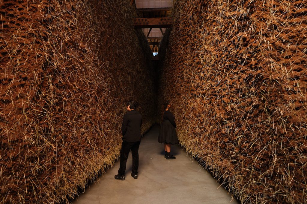 « Être en contact avec la terre et y pénétrer, c’est être en contact avec ce qui nous constitue et nous nourrit ; le substrat où la vie se développe tandis qu’elle est habitée par l’âme », explique l’artiste née en 1967 et installée à Bogota. Et d’ajouter : « Dans les traditions ancestrales andines, l’ê tre humain est une terre vivante, je suis un corps, je suis la terre. Dans l’espace d’exposition, la terre s’exprime, elle est le centre et le miroir de ce que nous sommes. » C’est aussi à une expérience sensorielle et métaphysique que nous invite l’artiste dont l’un des dédales de terre et de foin rehaussé de cannelle, de clous de girofle, de café et de chocolat s’intitule « Le lieu de l’âme » (El Lugar del alma, 2022).