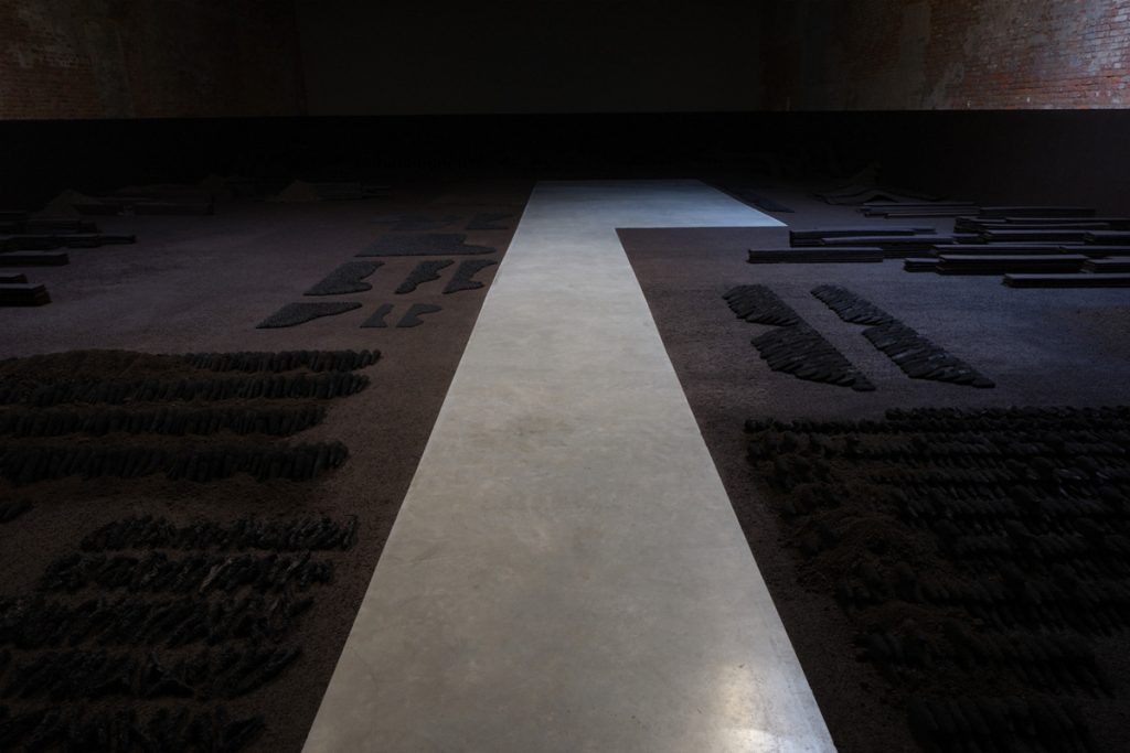Un hommage à la terre matricielle décliné aussi dans des oeuvres picturales sur textile, fibre naturelle et papier, créées au cours des deux dernières décennies, tandis qu’à New York une salle tapissée de boue évoque l’humidité maternelle, « amniotique », de la terre où « la mort fertilise la vie », et qu’un monolithe de terre suspendu invite les visiteurs à le caresser car « toucher la terre c’est être touché par elle ».