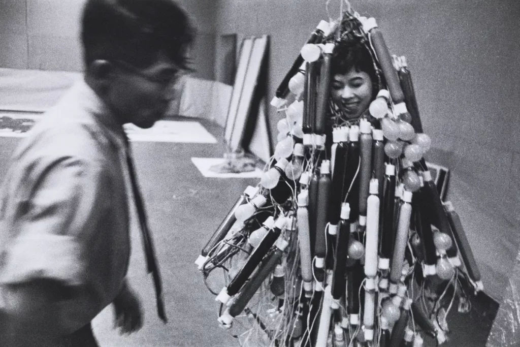 De grandes figures comme Atsuko Tanaka et sa mythique Electric Dress ont démontré comment l’art pouvait se combiner à la technologie dans une exploration sensorielle. Inspirée par les paysages urbains illuminés du Japon de l’après-guerre, cette œuvre fusionnait sculpture, peinture et performance pour refléter l’impact de l’électricité sur la vie moderne. Ces artistes ont souvent perçu la technologie comme un outil collectif, s’éloignant des intérêts militaires ou corporatifs qui dominaient son développement initial.