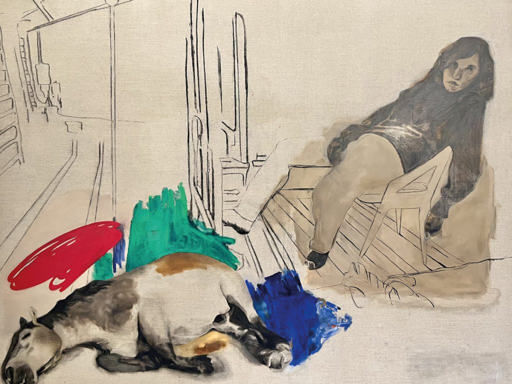 Corps, visages, pans d’architecture, lignes et signes… peints ou esquissés, parfois effacés ou biffés, les éléments composant les toiles de Doria Jeridi (tout juste diplômée des Beaux-Arts de Paris) entrent en collision sur le vide de la toile avec une force expressive et une puissance graphique évoquant les distorsions et désaxements de Francis Bacon.