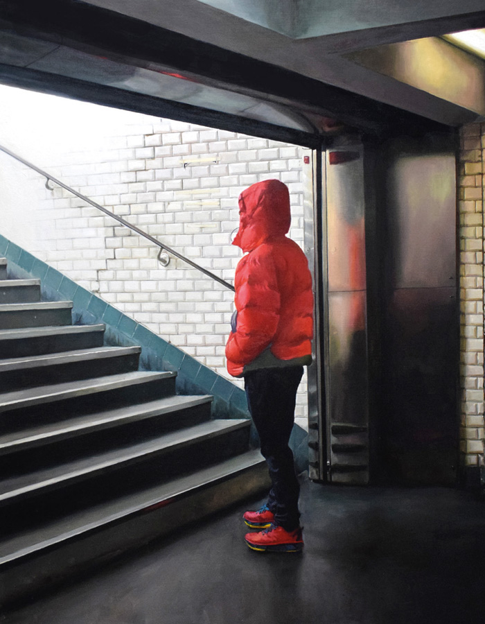 Du côté des jeunes, Nicolas Sage nous livre des portraits et des paysages architecturaux aux jeux de lumière presque expressionnistes très théâtraux, tandis que Manon Pellan joue au graphite de l’illusionnisme du trait et des blancs entre présence et absence. Bilal Hamdad, quant à lui, dépeint la solitude des êtres dans les paysages urbains (stations de métro, terrasses de café…), provoquant un sentiment d’étrangeté… que l’on ressent de manière plus prégnante encore devant les toiles peintes à l’huile, à l’acrylique et à la poudre de marbre d’Axel Roy, et pour cause : pour se concentrer sur « les interactions entre les gens », l’artiste a pris le parti de supprimer tous les éléments alentour (végétation, architecture, mobilier urbain… ).